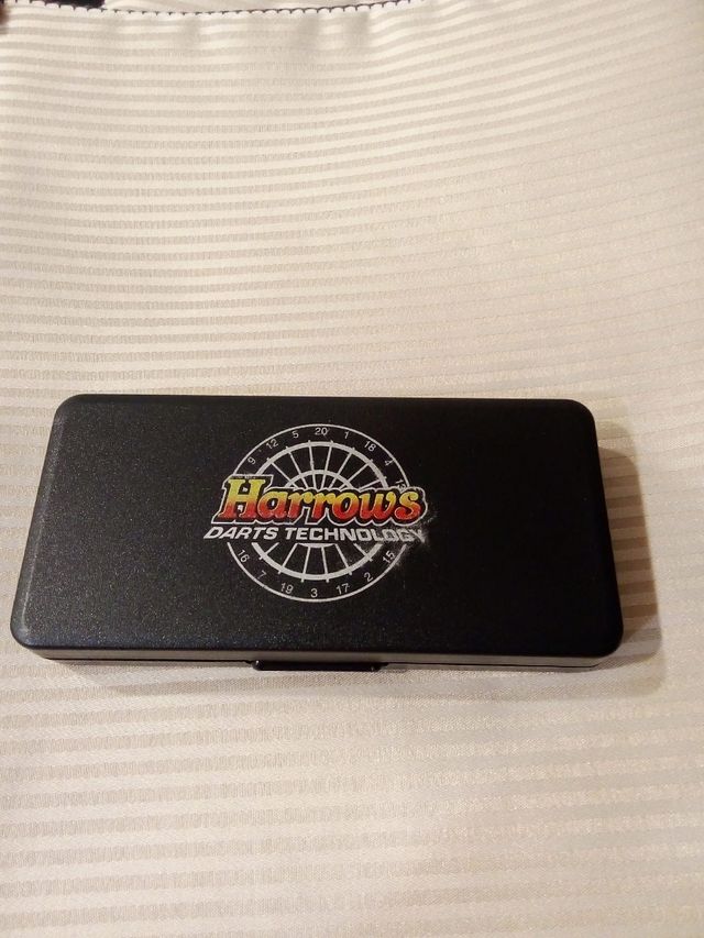 Detalles del productoEstuche HARROWS DARTS TECHNOLOGY diana electronica , vintage , muy completo y con todo el contenido en muy buen estado , muy cuidado : 3 dardos completos con cuerpo metalico, punta de plastico , caja de aluminio y pluma " Dimplex Mirror " en negro y gris ; ademas de otros 3 juegos de plumas , 24 puntas ( 4 punta larga y 20 punta estandar ) y 6 cañas de aluminio ( 3 en rojo y 3 en negro ). Peso de cada dardo montado : 15 grs. Precio de todo 30 euros.