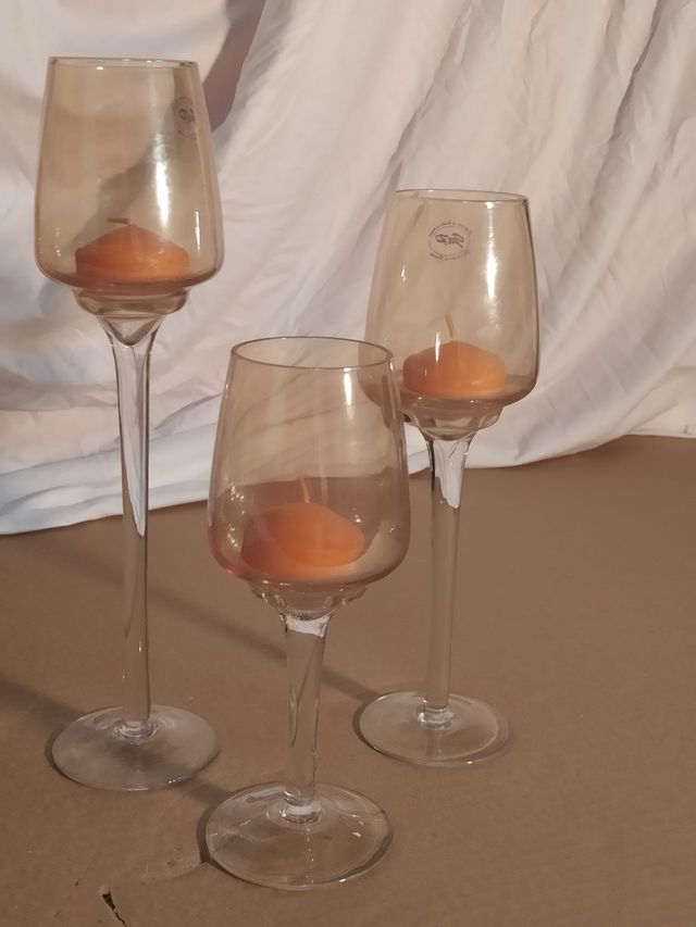 Detalles del productoElegante juego de tres candelabros de cristal con un toque de color ámbar. Perfectos para crear un ambiente cálido y acogedor.