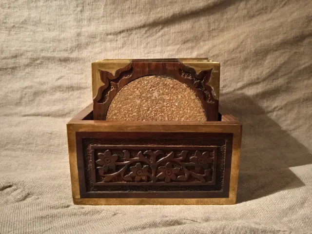 Detalles del productoJuego vintage de 6 posavasos artesanales hechos en madera labrada, con incrustaciones metálicas doradas de latón en las esquinas y centro de corcho natural. Son piezas decorativas y funcionales, ideales para protección de mesas, decoración rústica, estilo boho, retro, oriental, colonial, o para amantes de los objetos tradicionales hechos a mano. Cada posavasos mide 8 x 8 cm.