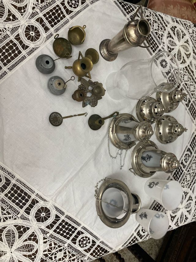 Detalles del productoPreciosa colección de artículos religiosos antiguos, ideales para decoración o coleccionistas. Se incluyen varios candelabros, portavelas, y otros objetos de metal. Algunos presentan un hermoso acabado plateado y otros son de latón. Son piezas únicas con un encanto especial.