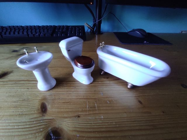 Detalles del productoConjunto de baño en miniatura escala 1/12, ideal para decoración o coleccionismo. Incluye lavabo, inodoro y bañera. Piezas de cerámica de color blanco, con grifos dorados en el lavabo y la bañera. Son artículos delicados y pequeños, perfectos para un espacio reducido.