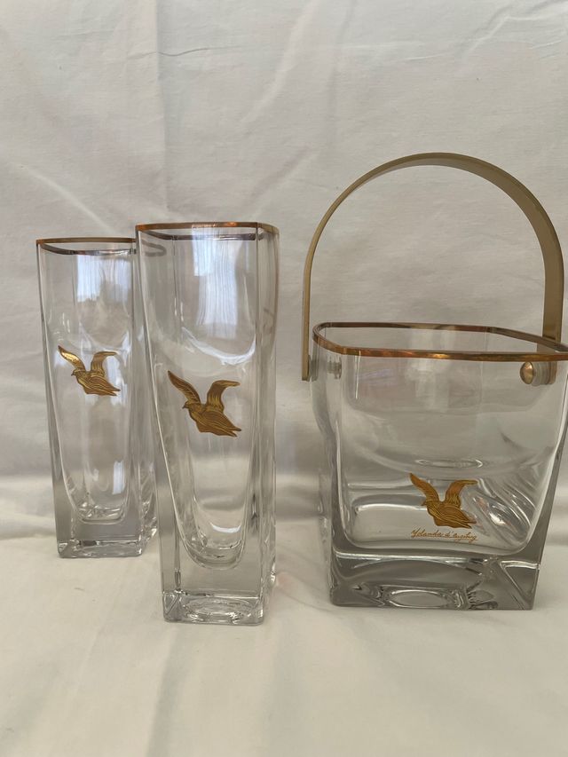 Detalles del productoJuego de bar de cristal y oro de Yolanda d’ Augsburg compuesto por 6 vasos altos de cristal de roca y cubitera con motivo pájaro dorado, reproducción escultura, diseñados por la pintora y escultora Yolanda d’ Augsburg.