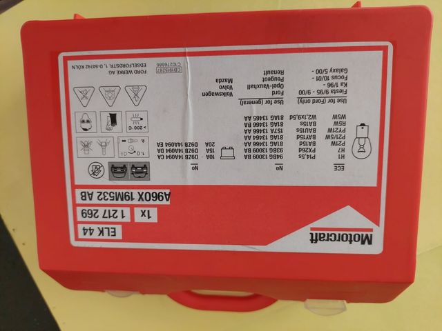 Detalles del productocaja bombillas y fusibles recambio Motor Craft para Ford, modelo Fiesta del 95 al 2000, Ford K, Focus 2001 a 2007, Ford Galaxy. La caja tiene un pequeño golpe en una esquina, se ve en foto . Medidas del producto