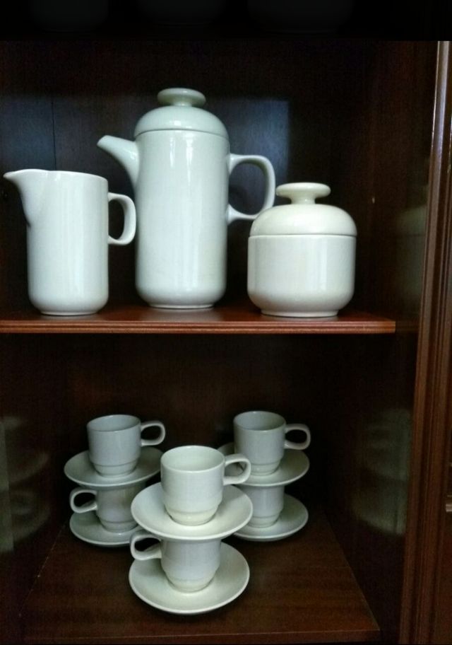 Antiguo Juego de café (Años 70). Está compuesto por: - 6 tacitas y sus platillos - Jarra para el café - Azucarero - Jarrita para la leche Muy bien conservado. Tiene poco uso.