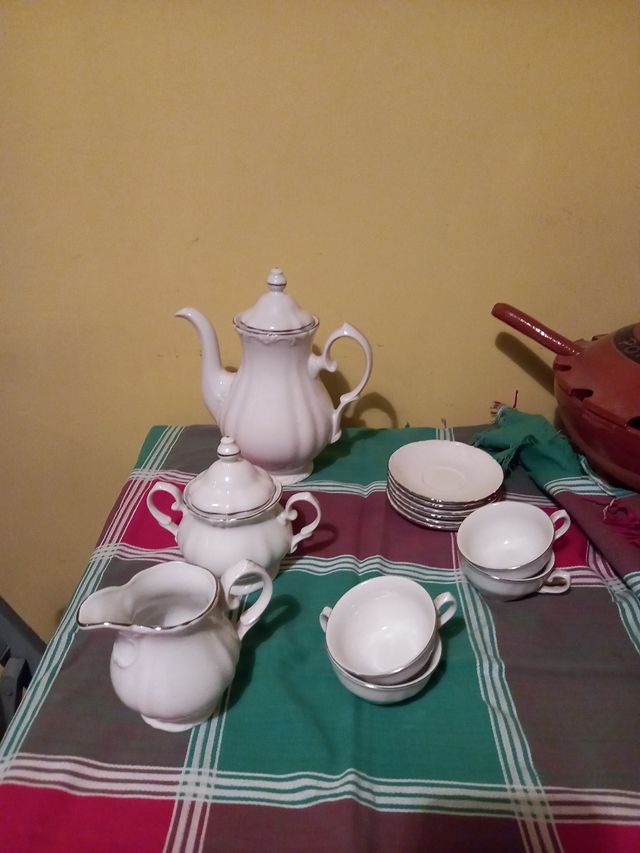 Juego de café de porcelana fina blanca plateada