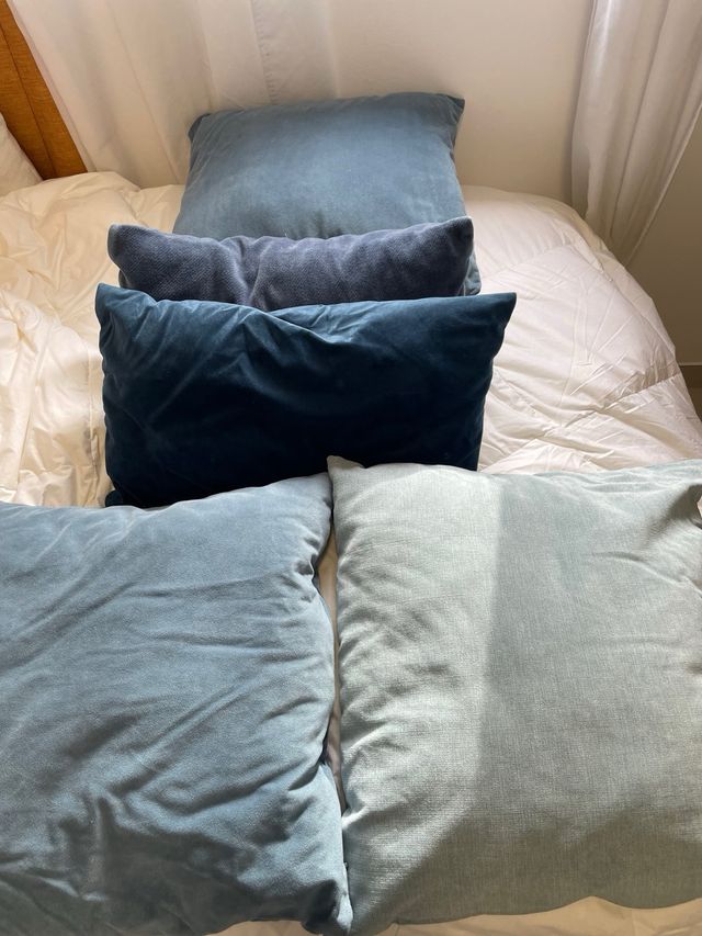 5 cojines con medidas standar en distintas tonalidades de azul. Con sus corresoondientes rellenos.