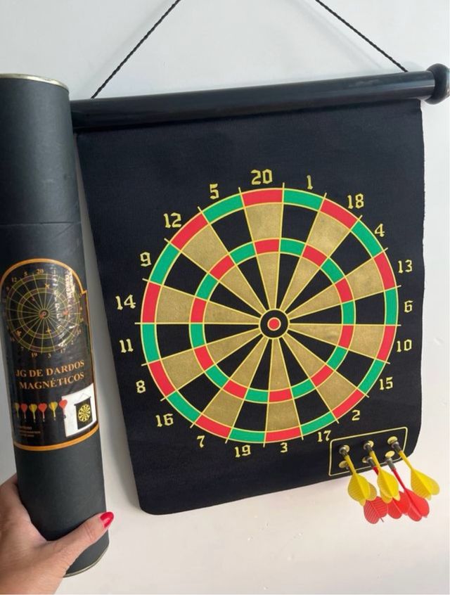 Juego de dardos magnéticos con diana. - Diana de tela negra con números. - Incluye 6 dardos magnéticos (3 rojos, 3 amarillos). - Viene en un tubo de almacenamiento.