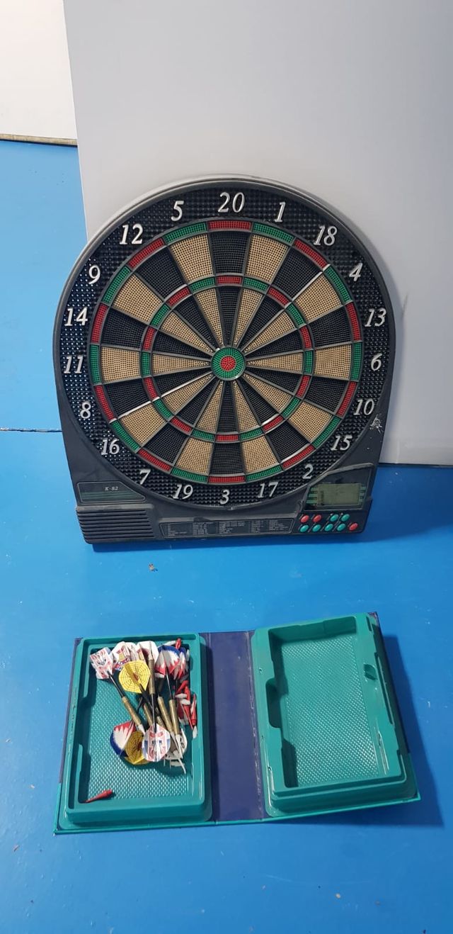 Set de dardos profesional con tablero electrónico. - Incluye un juego de dardos. - Diseño clásico con números. - Pantalla digital para puntuación.