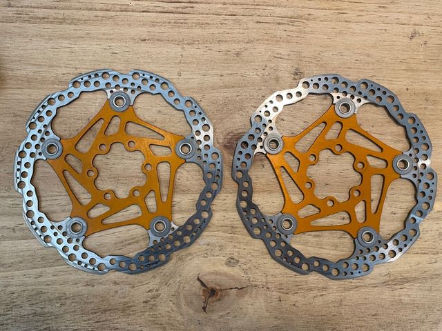 2x discos de freno flotantes Hope, color naranja. 160mm los dos. 6 tornillos. 2x Hope floating disc rotors in orange. Both 160mm and 6 bolt.