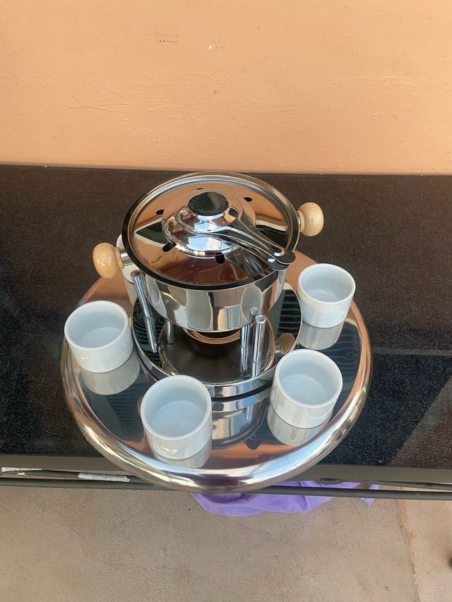 Juego de fondue de metal y madera