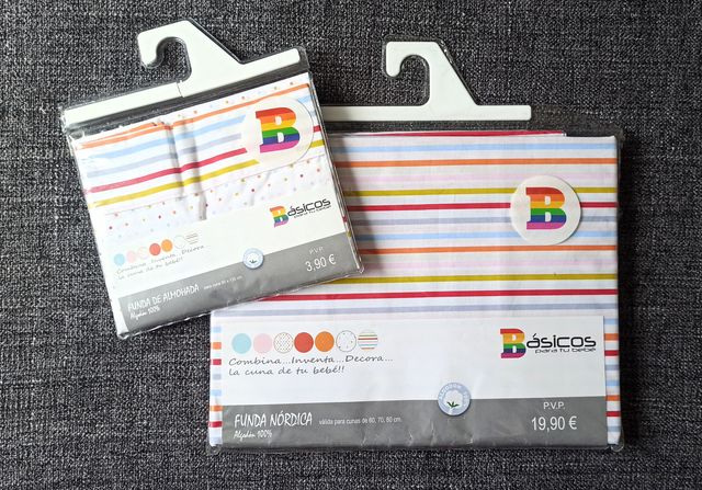 Detalles del productoFunda nórdica y almohadón cuna. Marca: Básicos para tu bebé. Talla: Válida para cunas de 60, 70 y 80 cm. Composición: Algodón 100%. Estado: Nueva, con etiqueta (Sin estrenar). Color: multicolor. Diseño: estampado puntitos y rayas de colores. NUEVO Y A ESTRENAR