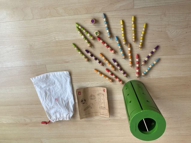Detalles del productoJuego de gusanos de madera de la marca Hape. Incluye varias piezas de colores y un cilindro verde.