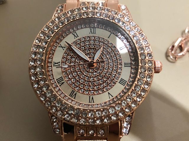 Reloj de cuarzo de lujo con diamantes de imitación y el resto de piezas a juego.