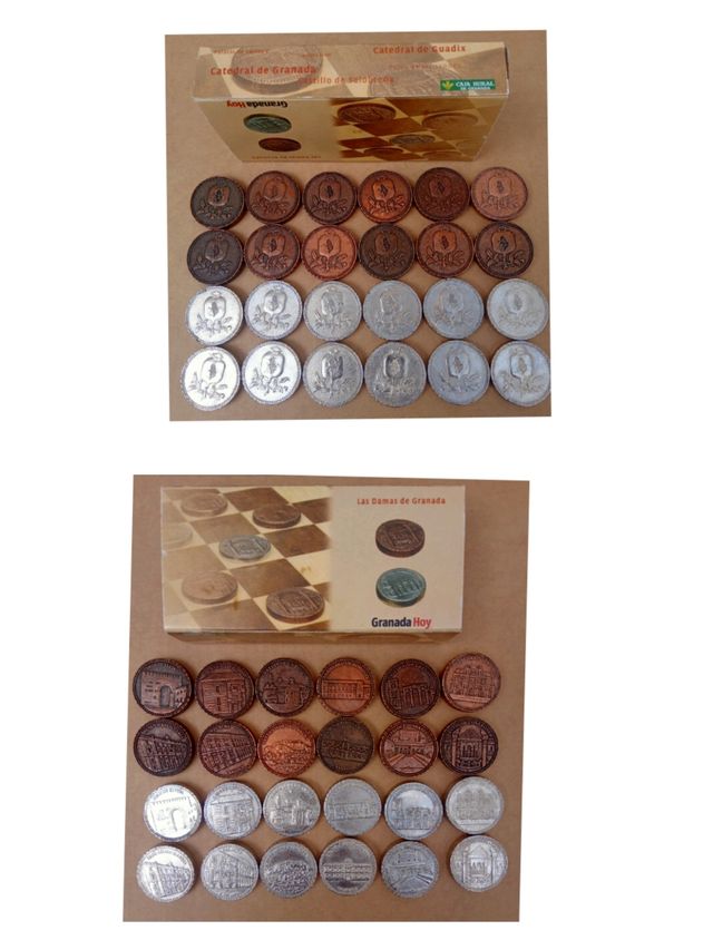 Detalles del productoFichas de bronce y aleación del Juego de las Damas dedicado a los monumentos de Granada y su provincia, por el reverso y por el anverso el símbolo de la Granada.