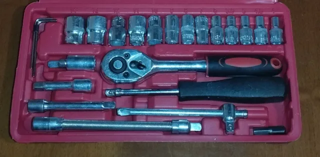 Detalles del productoJuego de llaves de vaso de 46 piezas, NUEVO. Incluye 21 llaves de vaso, 12 llaves, 14 accesorios y un maletín de transporte. - 21 llaves de vaso: 4-4.5-5-5.5-6-7-8-9-10-11-12-13-14mm. - 12 llaves: 4-4.5-5-5.5-6-7-8-9-10mm. - 14 accesorios: incluye barras de extensión, carraca, adaptador y más. - Maletín de transporte incluido.