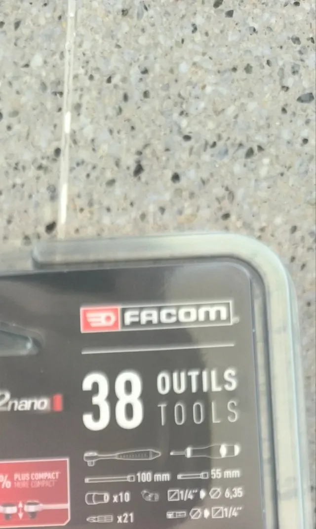 Set de herramientas Facom de 38 piezas. - Incluye 10 vasos de 1/4 (6,35 mm). - Incluye 21 vasos de 1/4. - Llave de carraca de 100 mm. - Llave de carraca de 55 mm.