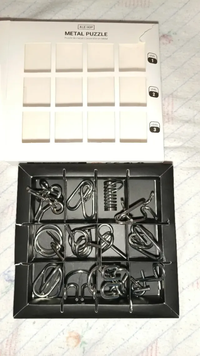 Detalles del productoSet de 12 puzzles de metal de la marca ALE-HOP, con diferentes niveles de dificultad.