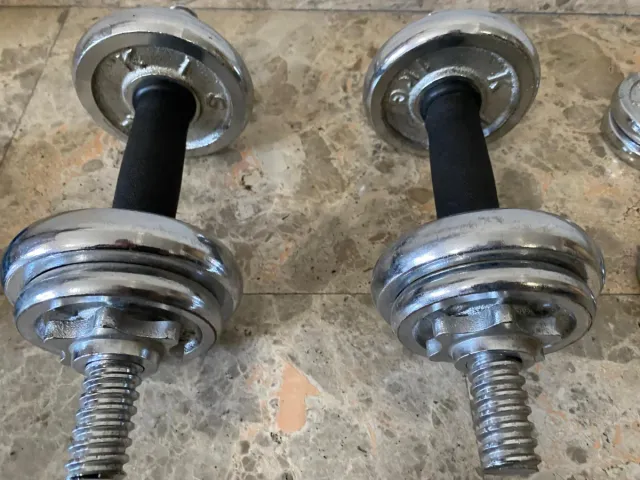 Detalles del productoSet de mancuernas con acabado cromado y mangos de goma.