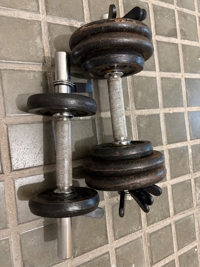 Dos mancuernas y barra. - Discos de hierro fundido (4 discos de 2,5k y 4 discos de 1,5k). - Barras con agarre texturizado. - Cierres de seguridad incluidos.