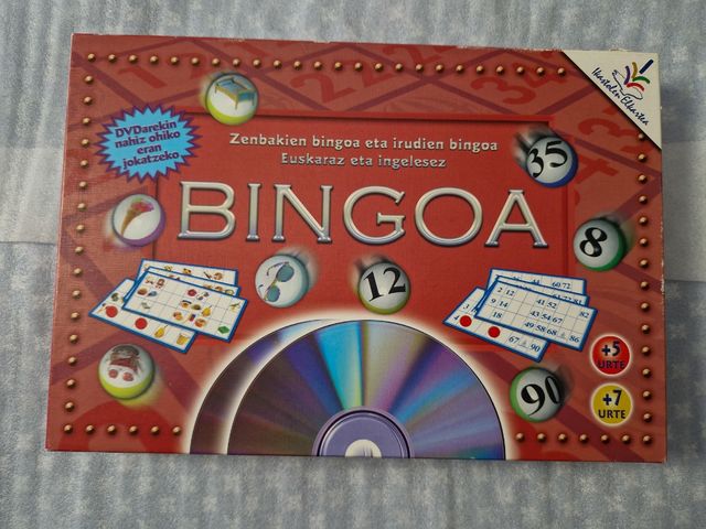 Detalles del productoJuego de Bingo con DVD en Euskera. Puede jugarse a un bingo de números o de objetos. Muy divertido para practicar Euskera. Usado muy poco y con todas las piezas incluidas.