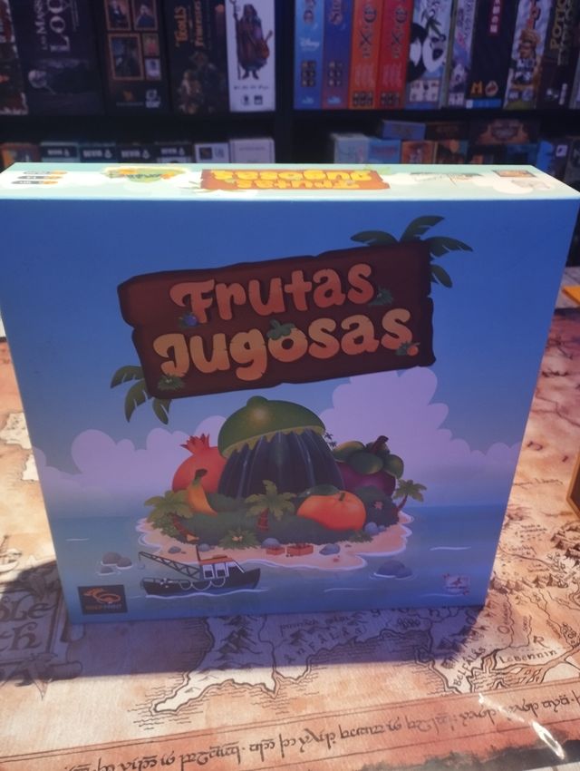 Juego de mesa Frutas Jugosas con temática tropical. - Ilustraciones coloridas de frutas exóticas. - Diseño de caja atractivo con escena de isla.