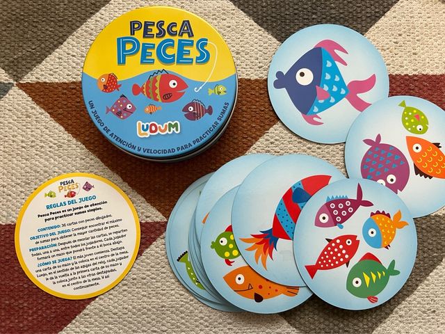 Juego de mesa Pesca Peces, ideal para desarrollar la atención y la velocidad mental mientras se practican sumas simples. Contiene 36 cartas con dibujos de peces.