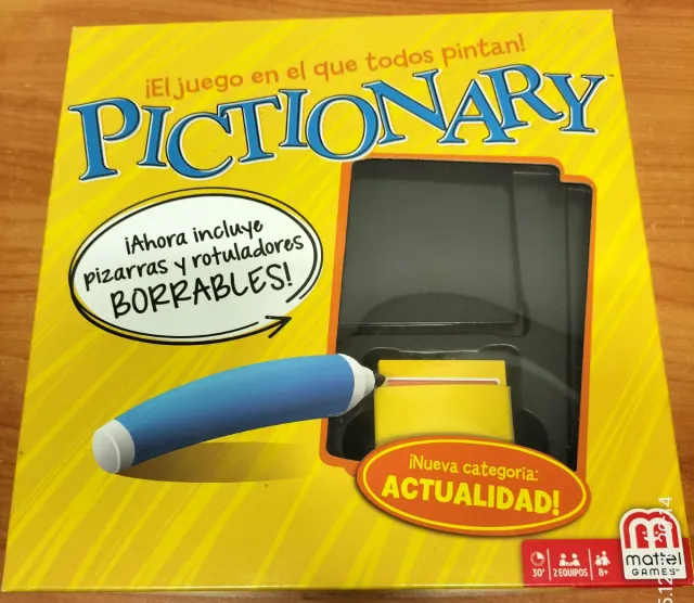 Detalles del productoJuego de mesa Pictionary, el clásico juego de adivinar palabras a través de dibujos. Esta versión incluye pizarras y rotuladores borrables.