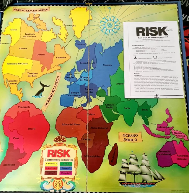 Juego de mesa Risk Travel, edición Gran juego de estrategia mundial. La caja está algo deteriorada - Incluye tablero, componentes y reglas. - Ideal para 2 a 6 jugadores.