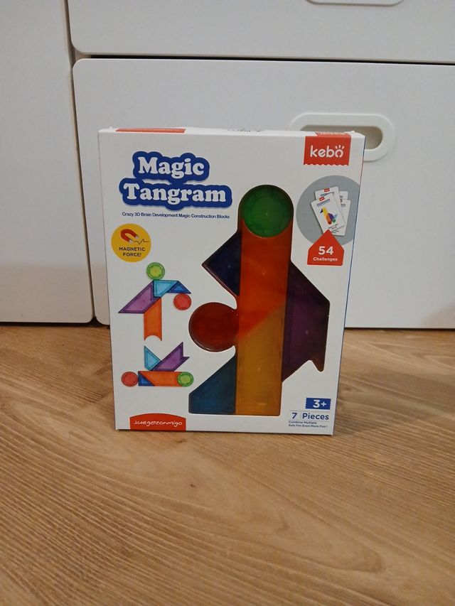 Detalles del productoJuego de construcción magnético Magic Tangram de Kebo, ideal para desarrollar la capacidad de razonamiento espacial. Incluye 7 piezas magnéticas de colores y 54 desafíos. El juego está en perfecto estado.