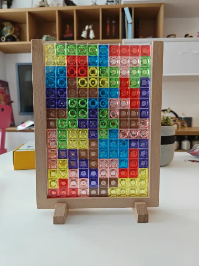 Juego de mesa con diseño inspirado en Tetris. Ideal para coleccionistas o como elemento decorativo. - Marco de madera. - Piezas de plástico de colores translúcidos.