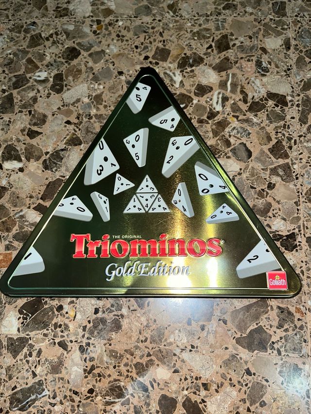 Juego de mesa Triominos Gold Edition. - Contiene fichas triangulares con números. - Incluye caja metálica. - Marca Goliath.