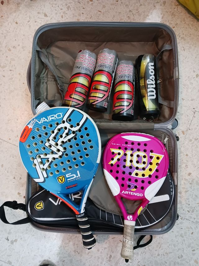 Detalles del productoJuego de dos palas de Padel y una funda, con 4 botes de pelotas, se puede vender por separado, pala grande 50€, pequeña, 40€ y pelotas, 20€. Medidas del producto