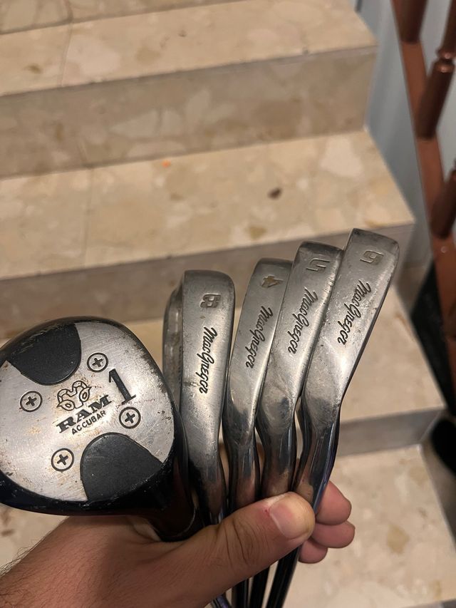 Detalles del productoConjunto de palos de golf que incluye un driver Ram Accubar y varios hierros MacGregor.