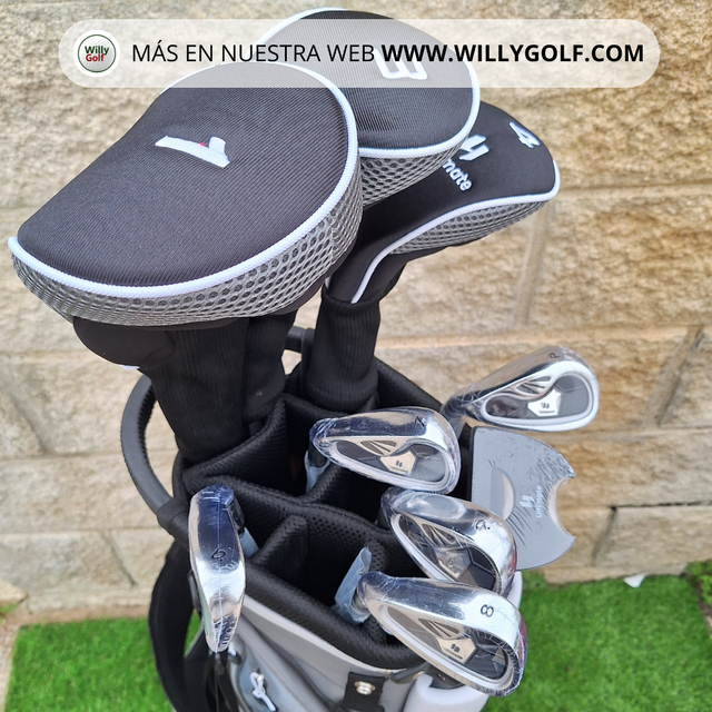 Juego de palos para hombre zurdo. Incluye 9 palos: Driver, Madera 3 15o, Híbrido 4 22o, Hierros 6-9, PW y Putter. Bolsa de golf estilo stand con 5 bolsillos, 8 separadores y funda de lluvia.