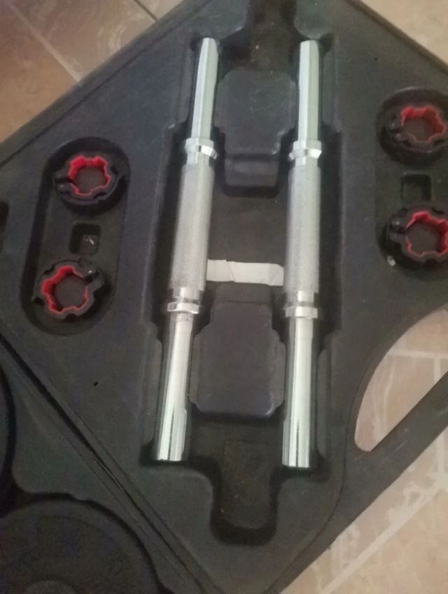 Detalles del productoSet de mancuernas con un peso total de 20kg, ideal para entrenamientos en casa. Incluye barras y discos.