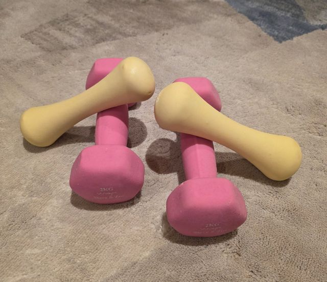 - Dos mancuernas rosas de 2kg cada una.