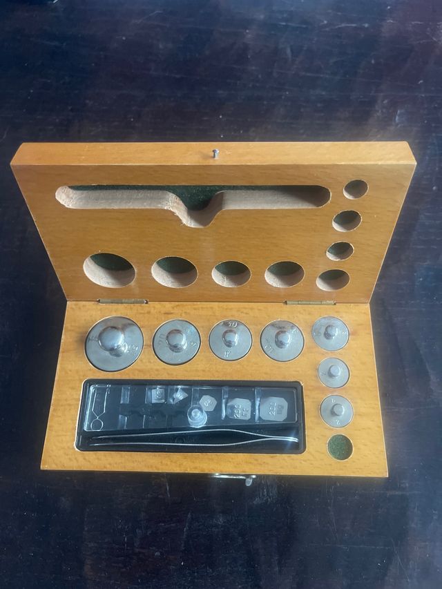 Detalles del productoConjunto de pesas de precisión en una caja de madera.