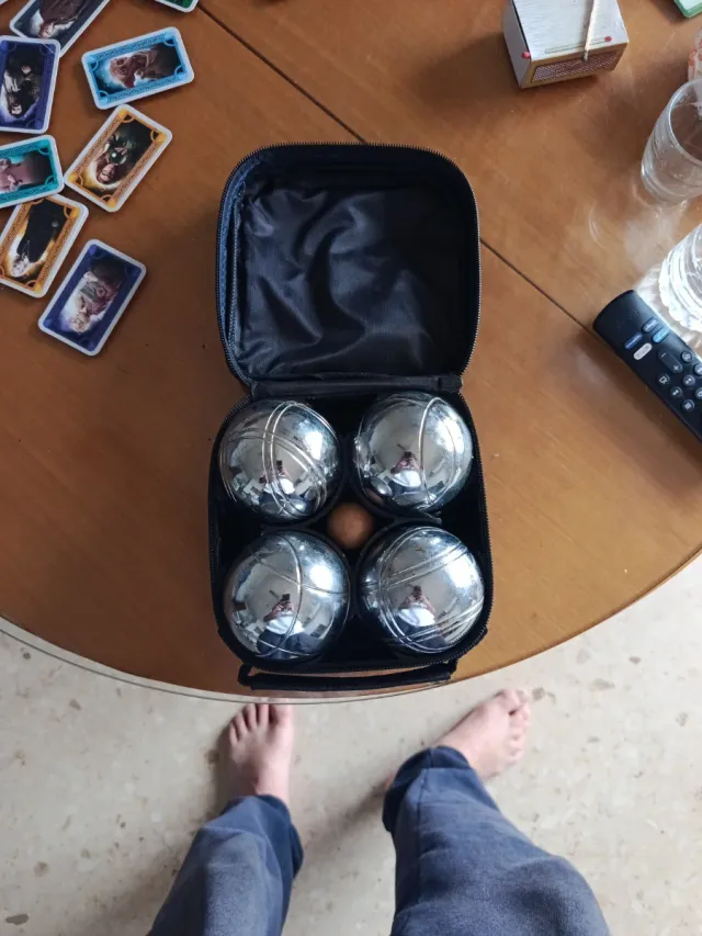 Detalles del productoSet de petanca con cuatro bolas metálicas plateadas, listas para jugar. Incluye una funda negra para guardarlas y transportarlas fácilmente.
