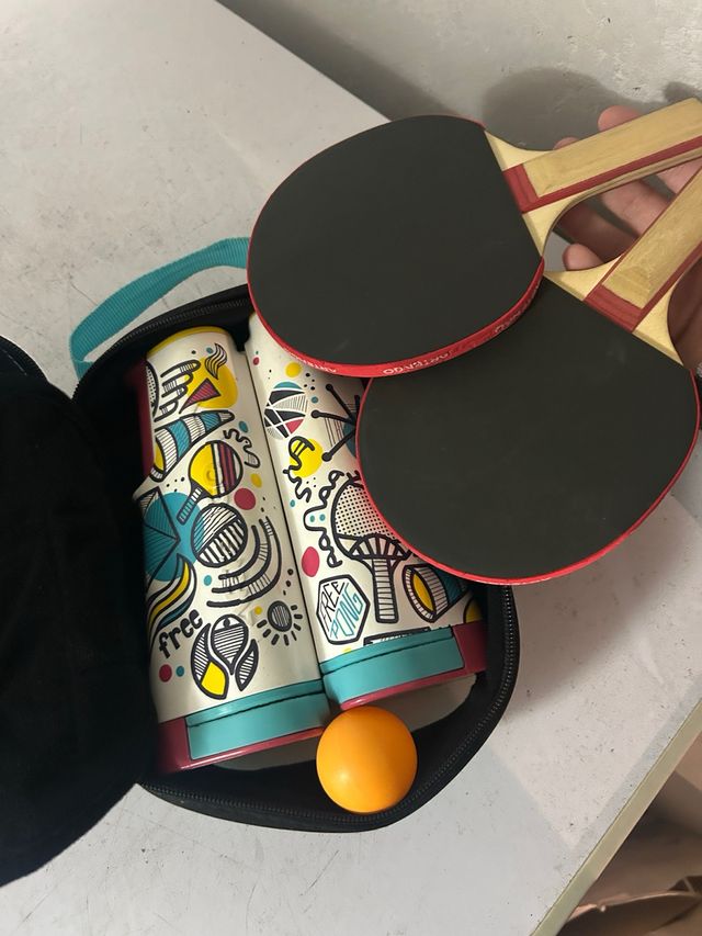 Detalles del productoSet de ping pong portátil con un diseño divertido y colorido.