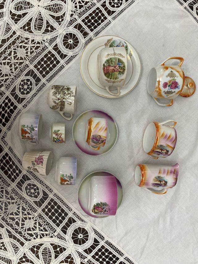 Detalles del productoPrecioso juego de té antiguo, ideal para coleccionistas o amantes de lo vintage. Se compone de varias piezas delicadas y pintadas a mano con escenas románticas.