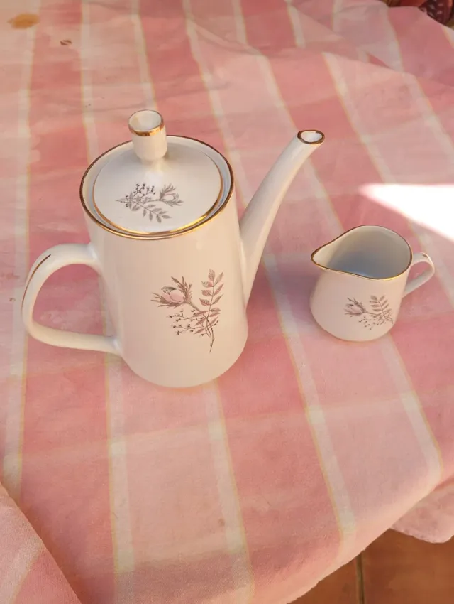 Elegante juego de té o café con detalles dorados. - Diseño floral. - Acabado brillante.