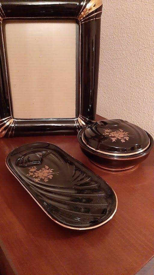 juego de tocador en negro y dorado que consta de 3 piezas