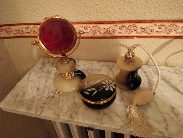 Detalles del productoElegante juego de tocador vintage con detalles decorativos.