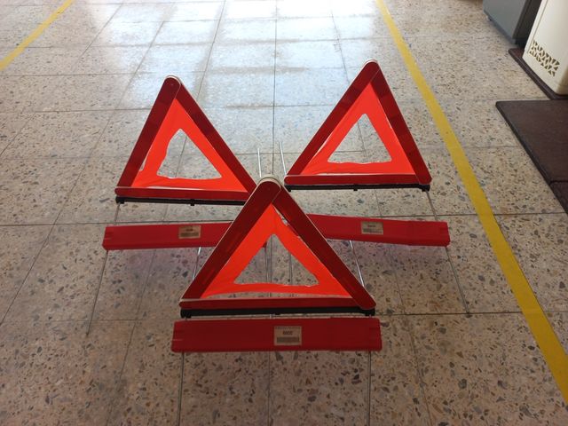 Detalles del productoJuego de tres triángulos de señalización de peligro, homologados, y con sus correspondientes estuches. Marca Geka, modelo Delta 1. Tamaño del lado del triángulo: 43cm. Se ofrece el lote de los tres triángulos por 12 €, y cada triángulo por separado a 5 € la unidad. Están nuevos, sin ningún uso.