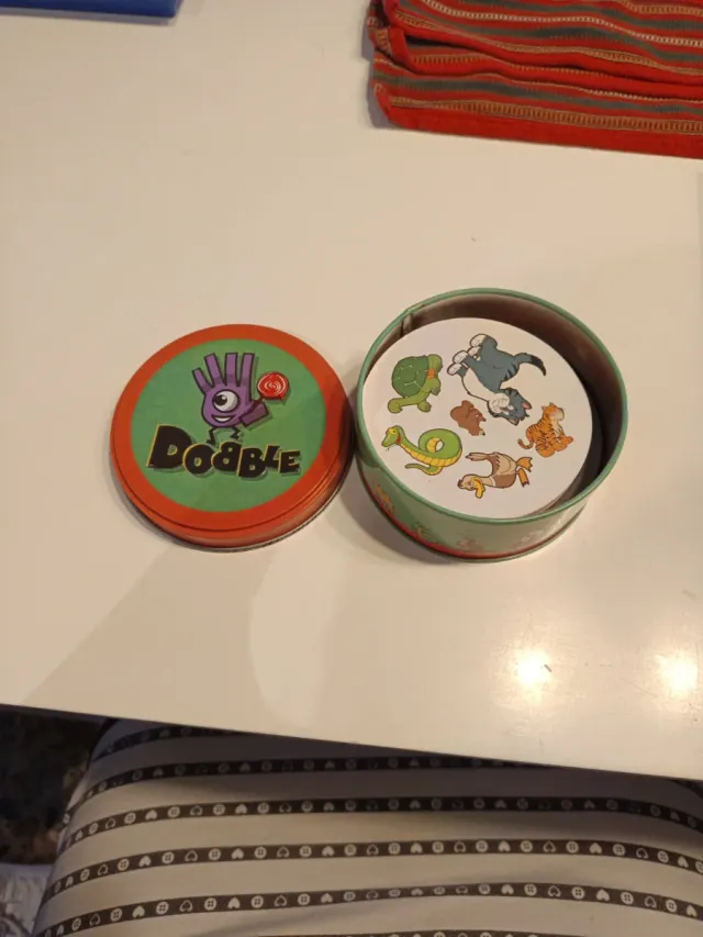 Juego de cartas Dobble, ideal para jugar en familia o con amigos. - Contiene una lata metálica. - Incluye cartas con diferentes símbolos.