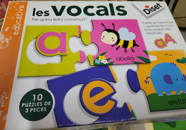 Detalles del productoJuego de puzzles para aprender las vocales en catalán. Incluye 10 puzzles de 3 piezas cada uno.