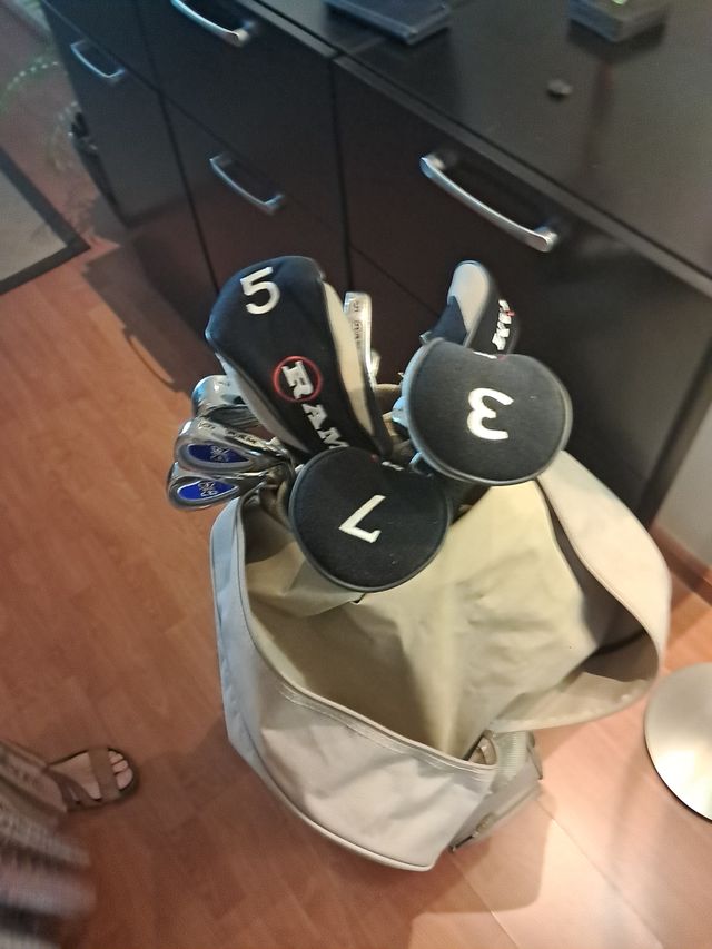 Detalles del productoSe vende juego de golf prácticamente nuevo. Incluye 11 palos de golf RAM en una funda beige, 2 botes de 3 bolas de golf Callaway y tees. Los palos se ven en muy buen estado.