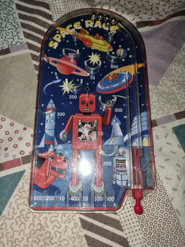Divertido juego de mesa infantil con temática espacial. - Diseño de Space Race. - Incluye bolas metálicas para jugar. - Marcadores de puntuación integrados.