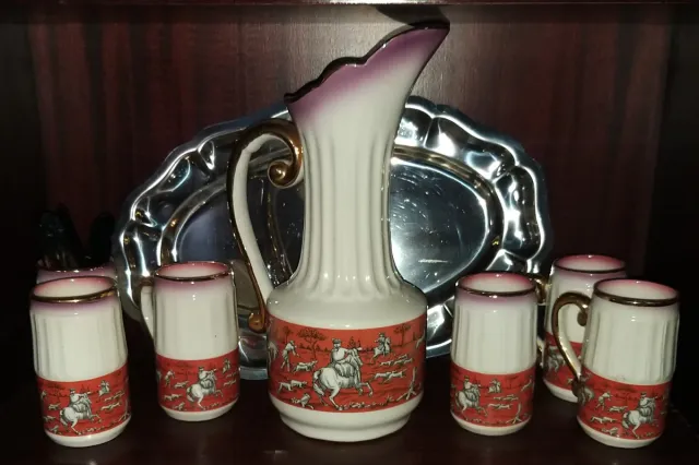 Detalles del productoConjunto de jarra y vasos con un diseño vintage y una escena de caza.