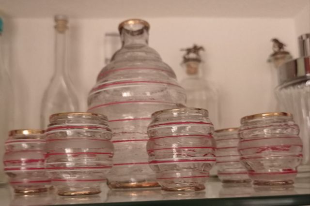 Detalles del productoElegante juego de licorera y vasos, ideal para coleccionistas. La licorera y los seis vasos pequeños son de cristal transparente con finas rayas rojas y blancas. Los vasos tienen un fino ribete dorado en el borde. Un toque vintage para tu hogar.